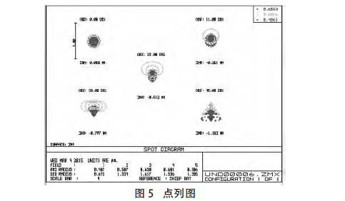 光扇圖是關于光瞳坐標函數(shù)的光線像差,繪圖的數(shù)據(jù)是光線與像面交點的坐標和主光線與面交點的坐標之差。它們可以很好地反映像面上光線的實際會聚情況[9]。如圖 4 所示,光線的會聚情況是比較良好的。